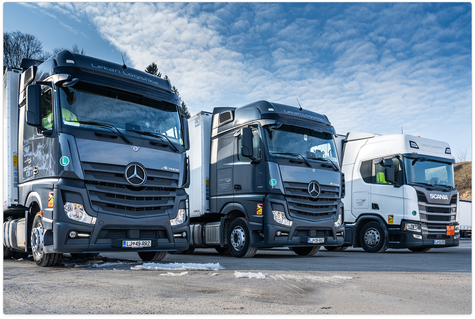 Naš vozni park obsega lastna, sodobna vozila, ki so v povprečju stara dve leti. Vozni park redno posodabljamo in povečujemo. Vsa vozila so opremljena z GPS sledenjem in nadzorom temperature. Po potrebi razpolagamo tudi z vozili ostalih dimenzij.